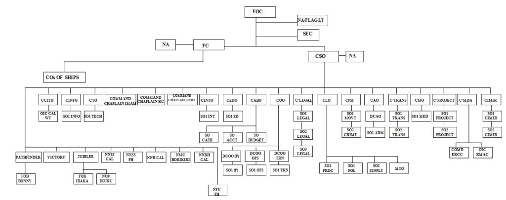 The organogram of ENC is as shown below. The major units/components are the Eastern Fleet, NNRH, NNS VICTORY, NNS PATHFINDER, NNS JUBILEE, FOB BONNY, FOB IBAKA, NOP IKURU, MDA, BMUs, NNRH, NNH and NN Welfare Schools.